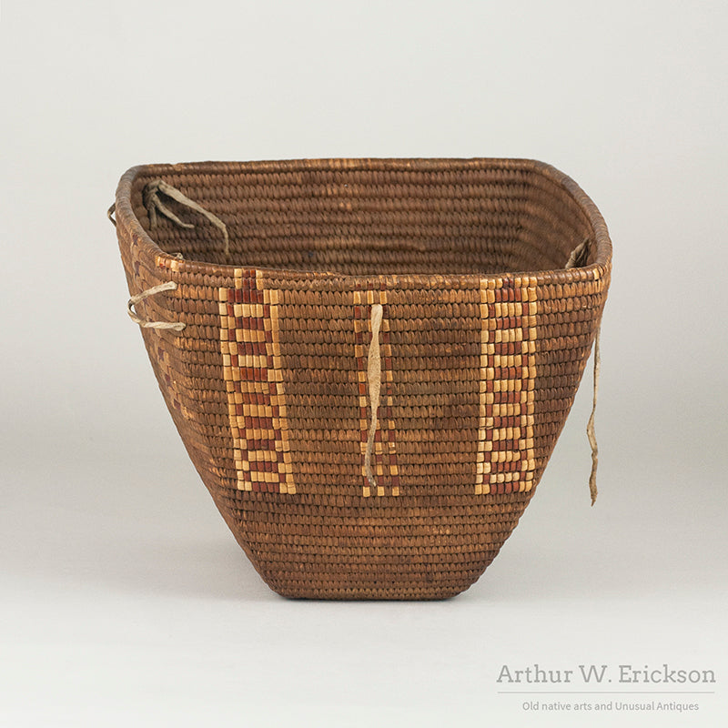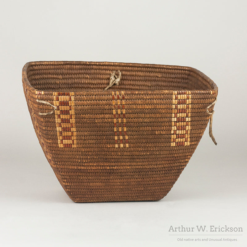 This is a handsome and understated coiled basket with simple, attractive vertical bands of design in yellowish and red imbrication. Each side has three vertical bands of design with the designs on the ends longer than the ones on the sides. The two outer bands are wider and fully imbricated and the interior designs are simpler with three vertical bands spaced a stitch apart. The effect of the designs is very pleasing.