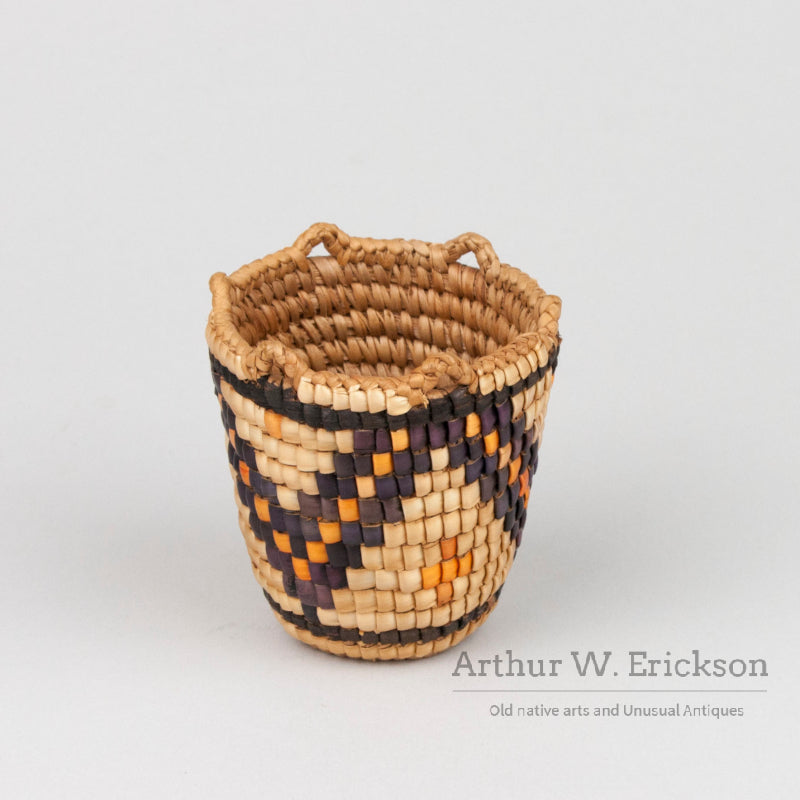 This is a beautifully made fully imbricated miniature Klickitat basket with small even stitches. The design is a classic Klickitat design with orange crosses in the spaces between the"V's" and a orange center stripe in the "V's". When I bought the basket, I found a tag in the basket  that said "Elsie Thomas Bingen". The quality of the design and the workmanship in the basket is consistent with the quality of her work so I am convinced that it was woven by Elsie Thomas.
