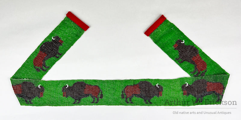 This is a great loom beaded belt with a heard of six big buffalos with white horns on a green beaded field. I don't know who made it but it is a dynamic piece of beadwork. Don't let the buffalos thunder away.