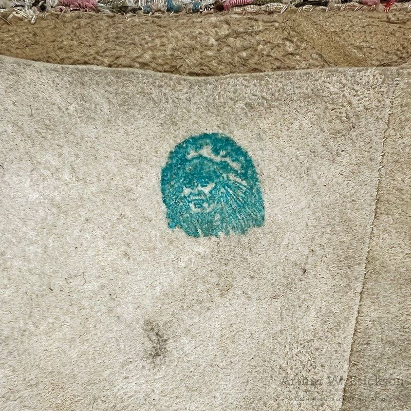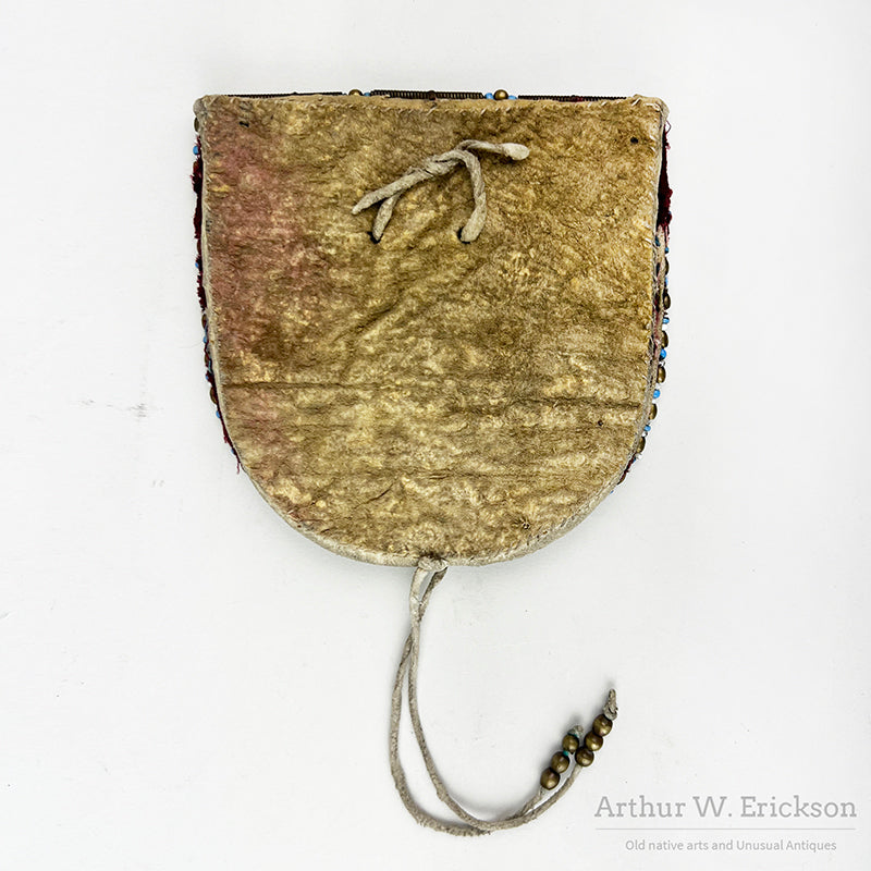 This is a really interesting belt pouch. The design is a flower with two blossoms on a stem with two leaves on a darker blue background. It is edged on three sides with oval brass beads separated by two small white and one light blue beads. Across the top are three sections of small brass spring like pieces and the two drops have brass beads on them as well. A very visual and unusual treatment. This beaded front is from an earlier belt pouch.  The pouch is commercial leather and more recent but with a back of old buffalo hide. A good and interesting piece for the collector or for someone who wants a more unusual piece of beadwork.