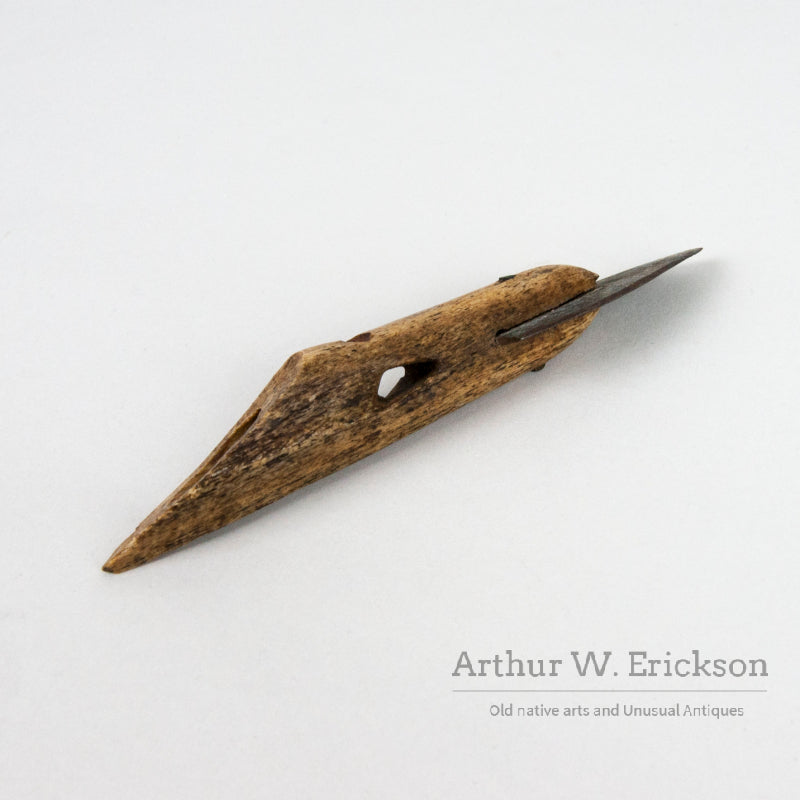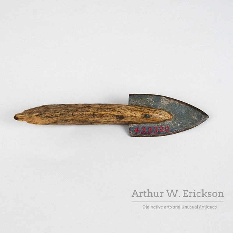 This is a bone toggle harpoon head a with triangular shaped metal blade which is secured with a metal pin. The blade has a six digit number in red ink on it. The harpoon head is dark from use and is in excellent condition. A good artifact.
