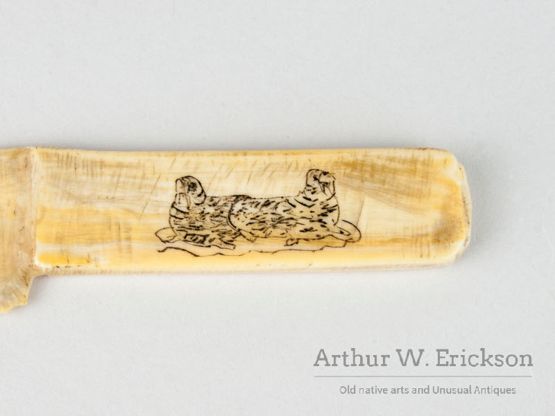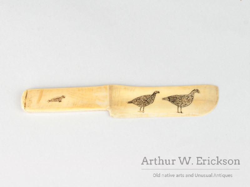 This is a fun little butterknife shaped letter opener carved from old walrus ivory. It has scrimshawed figures on all four faces. The handle has two walruses on one side and a small seal on the other side. On seal side the blade has two ptarmigan and the walrus side has a salmon. An all-around nice group of critters. There is one tiny chip at the very back of the blade, otherwise it is in excellent condition.