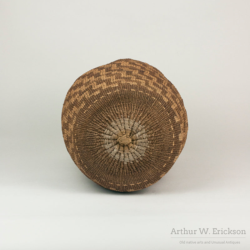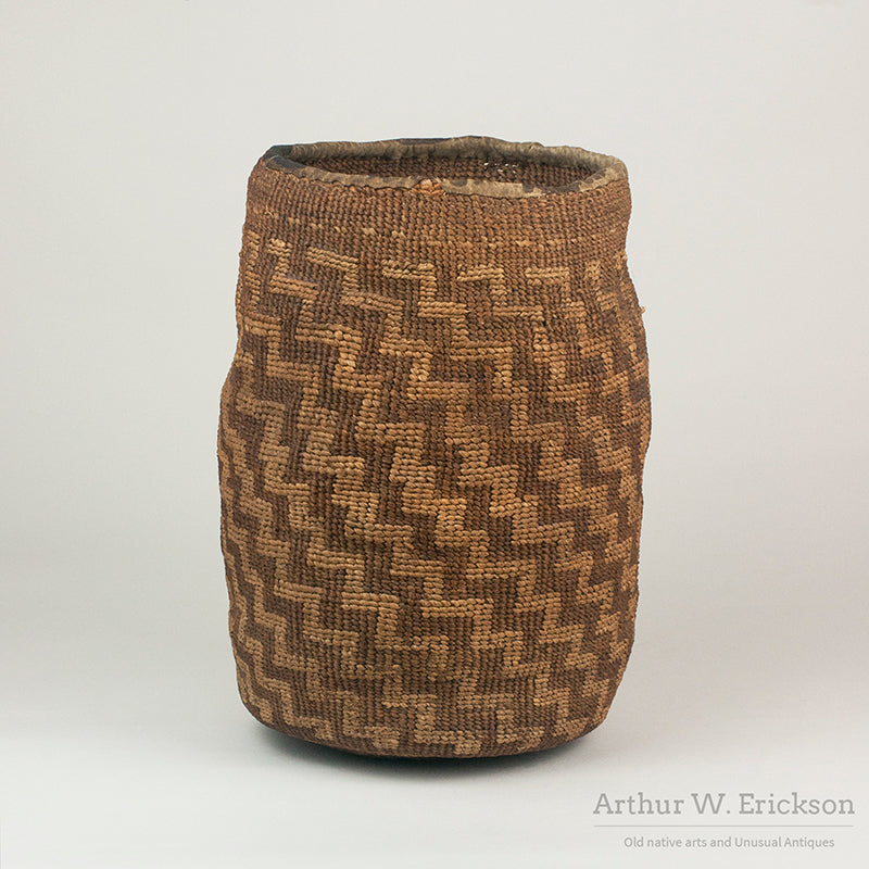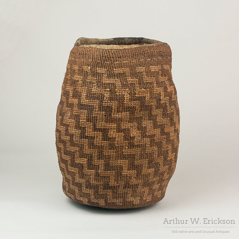 This is a great late 19th century Plateau root bag. It has an overall design of closely set stepped vertical bands going up and to the left which stops about 2" from the rim. In the vacant space is a single narrow horizontal band. The rim is wrapped with a narrow leather band which shows years of use. If you appreciate old working baskets that were well used with great designs, this is a basket you should seriously consider.
