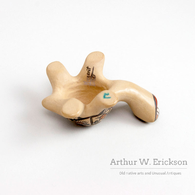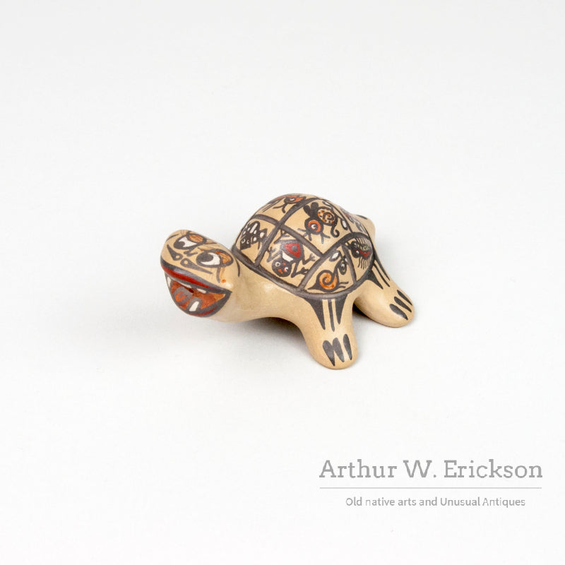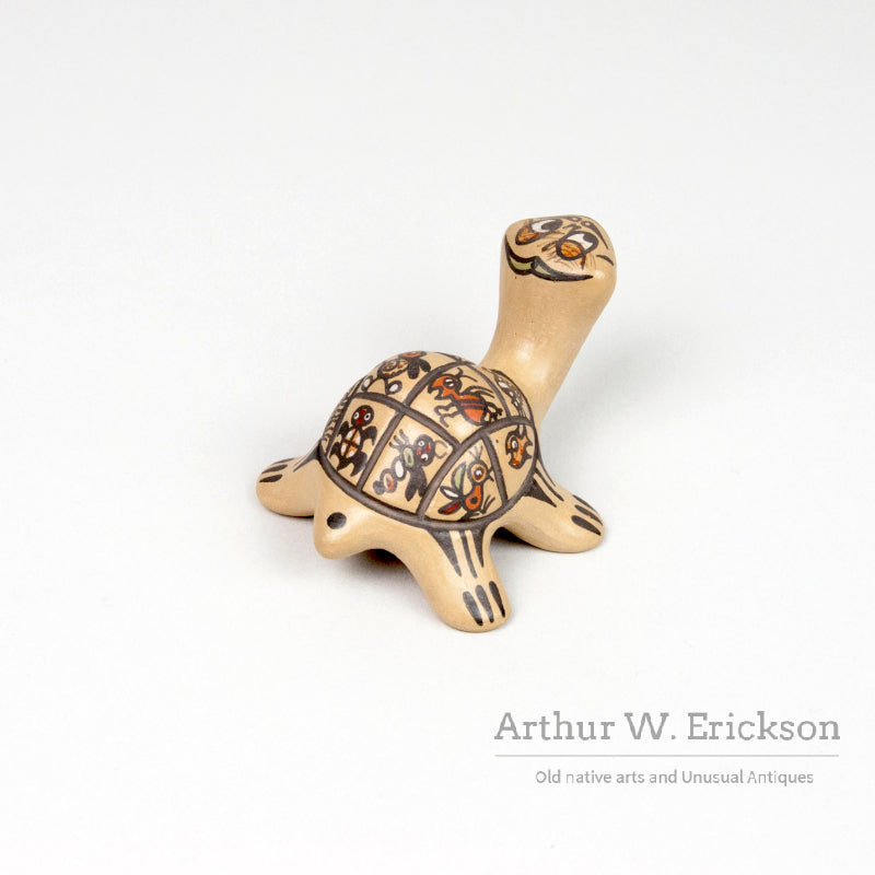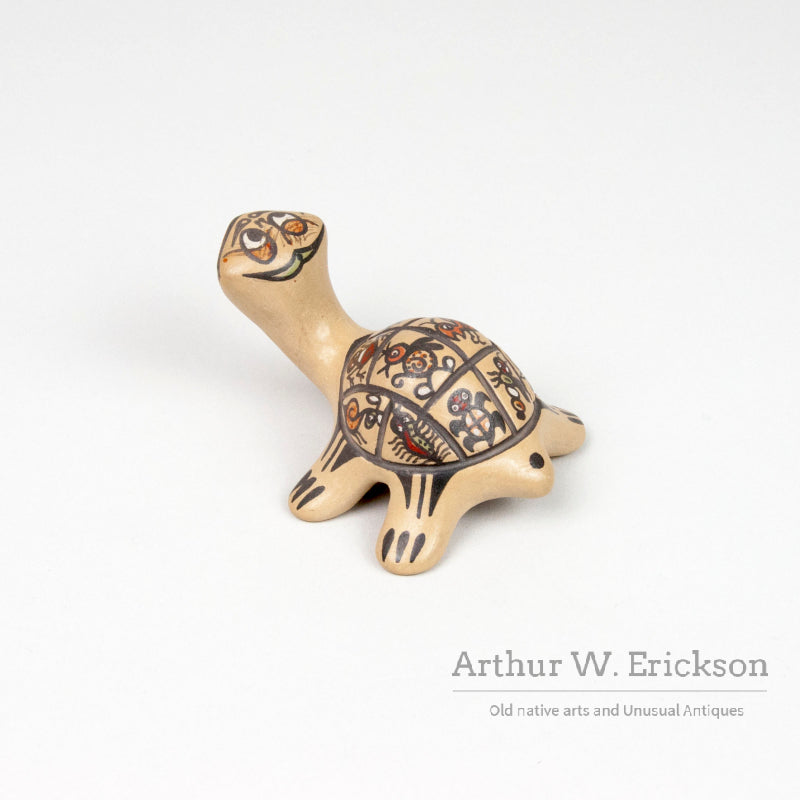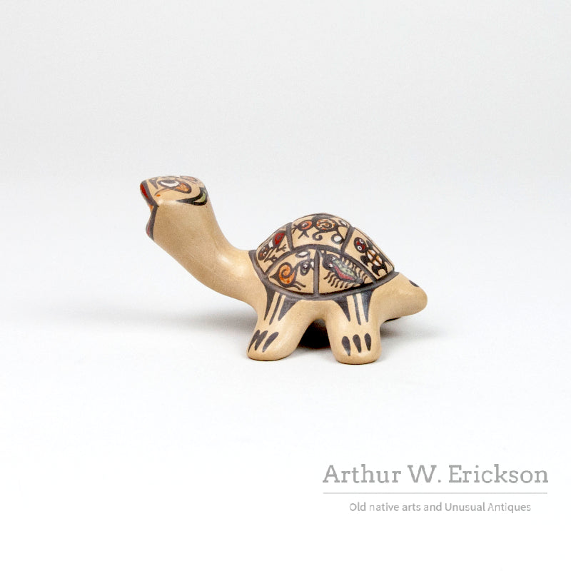 This is a whimsical and colorful pottery turtle created by Margaret and Luther, the award winning Santa Clara potters. It is humorous and charming. The turtle is in excellent condition and is signed on one leg "Margaret and Luther". This is from the Southwest pottery collection of Rhonda Mast.