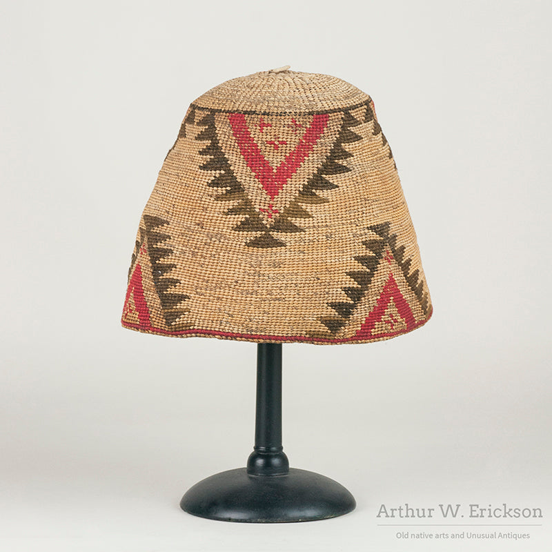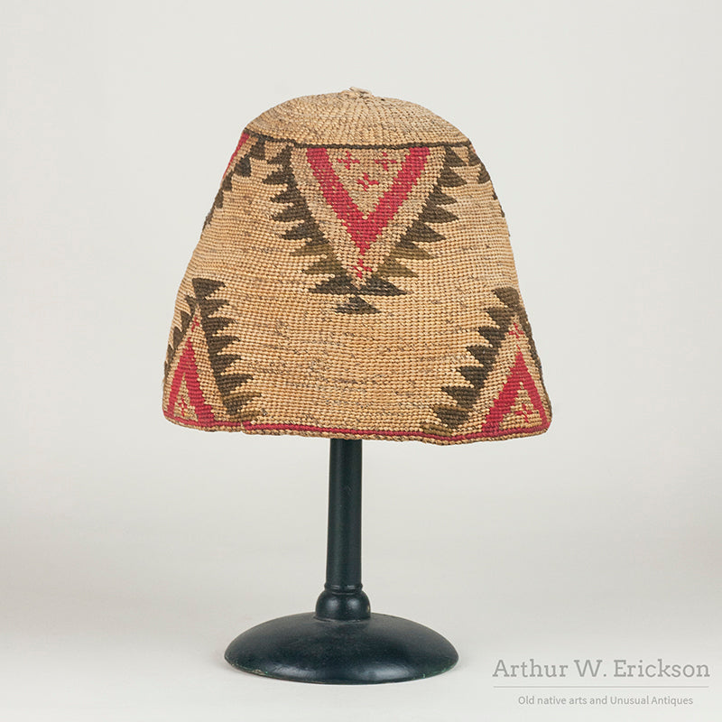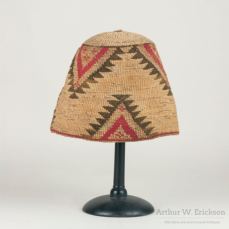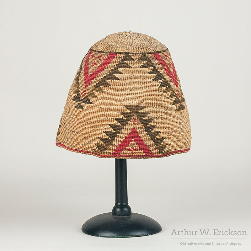 This is a wonderful early Plateau woman's hat in the truncated cone shape of a fez. It has the classic design of downward facing triangles below the top and upward facing triangles around the rim in a "zigzag" pattern. Each of the triangles has a smaller red wool open triangle within it with one to three crosses in the open space within the triangle. It has a narrow red wool band along the rim. This is a well worn and loved hat. There is some loss in the red wool in some places. The old beargrass hats are hard to find and this is a really good example.