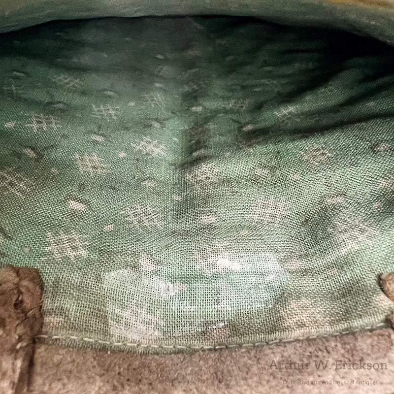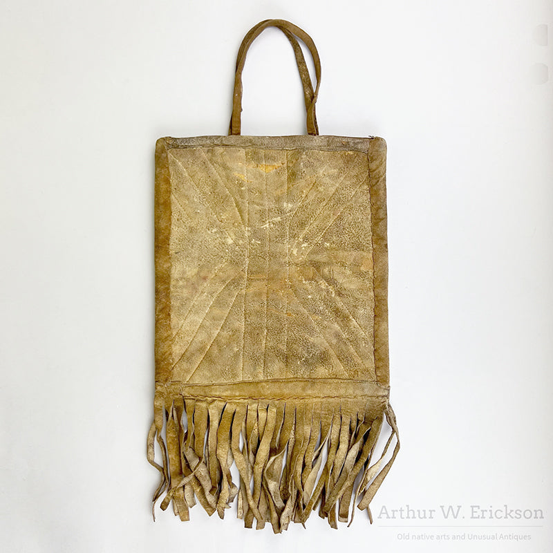 Take a good look at this bag. It has a lot of pizzazz. It has a large sparkling yellow diamond in the center outlined by red triangles with four arrow points in the center on a blue background. It is bound in native tanned leather with leather fringe and a leather back with design. This will look great on your wall.