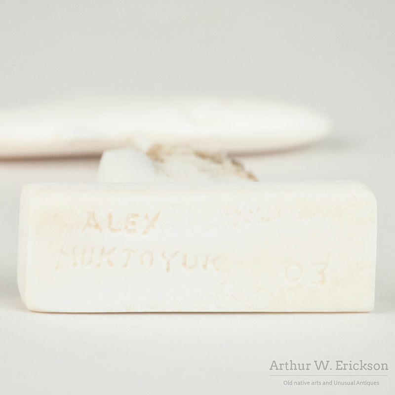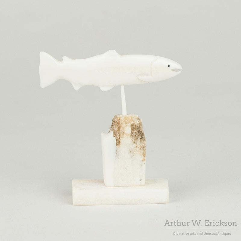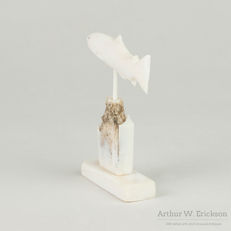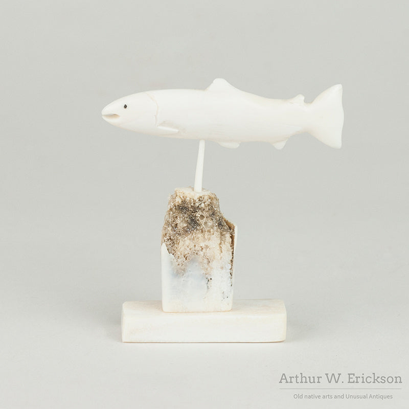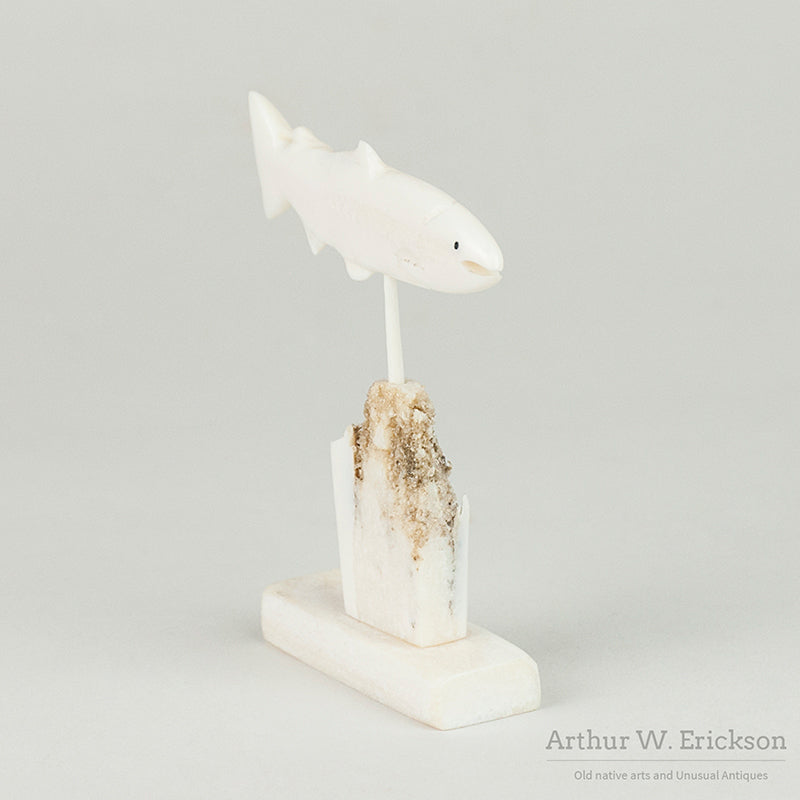This is a carving of large salmon with its mouth open, probably swimming up stream to spawn. Part of the stand is a fragment of an older piece of ivory giving the salmon a feeling of being in the wild.