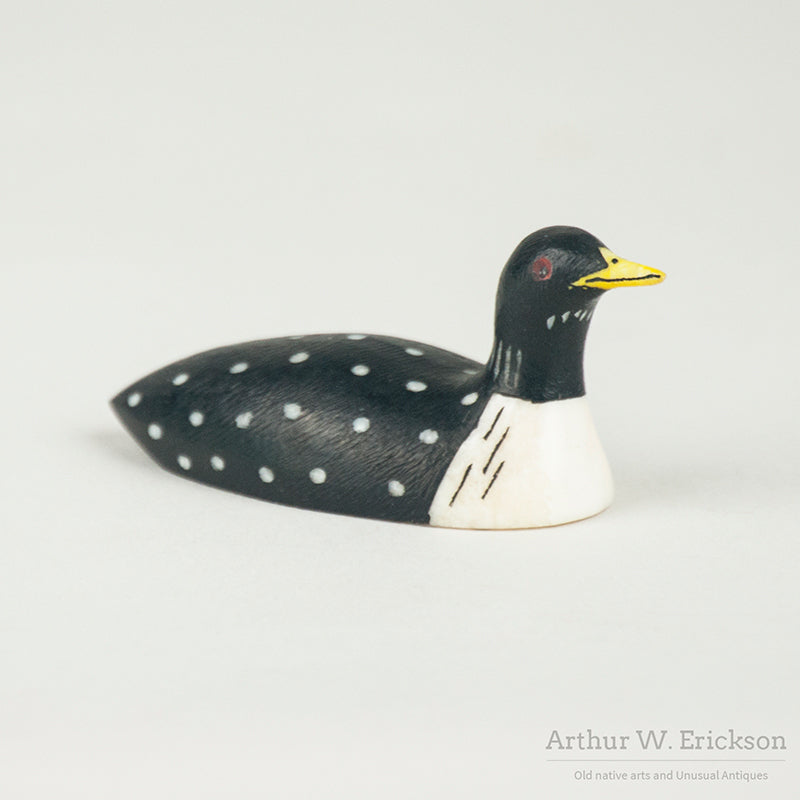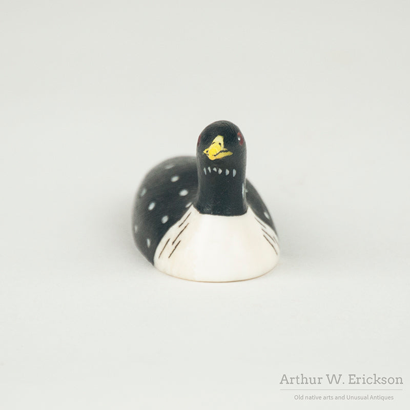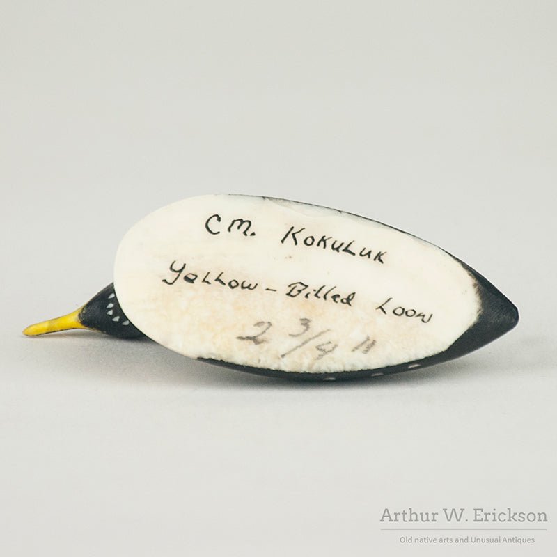 This is a beautifully carved and scrimshawed loon figure by the very skilled Inuit carver Charles M. Kokuluk. His family is from King Island and he moved with his family to Nome in 1952. The artist specialized in birds and this is a fine example of his skill and artistry. It is signed on the bottom "C M Kokuluk" and "yellow billed loon". This carving will be a dramatic figure in your collection.
