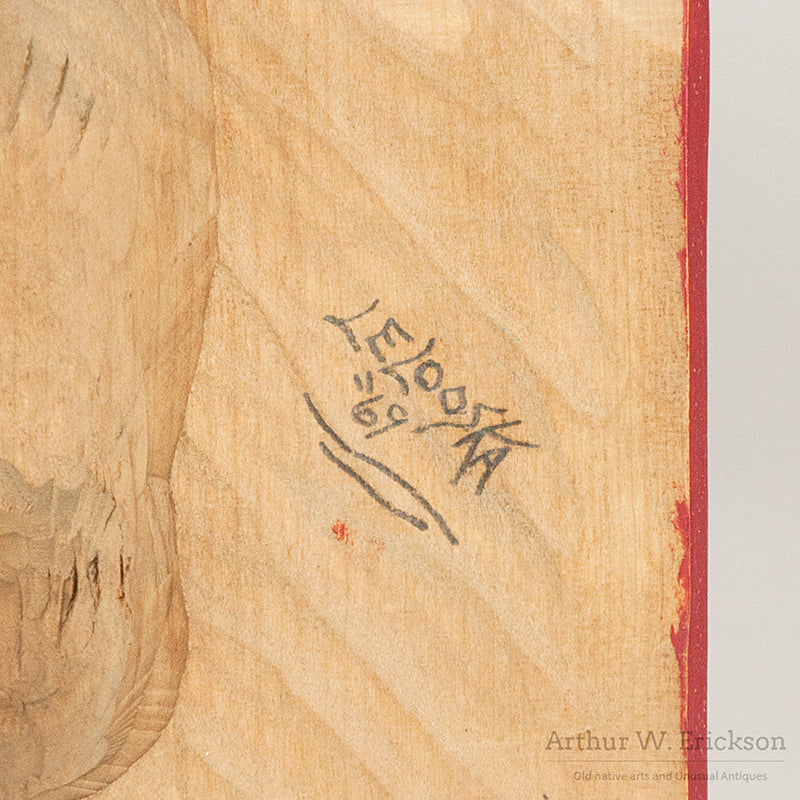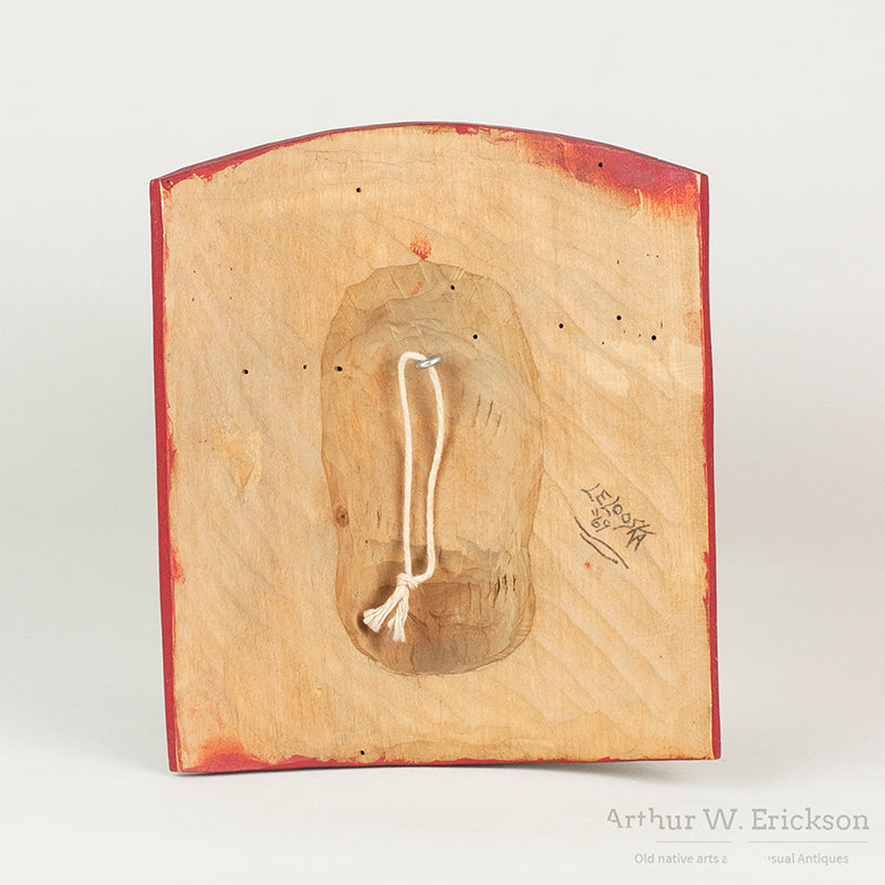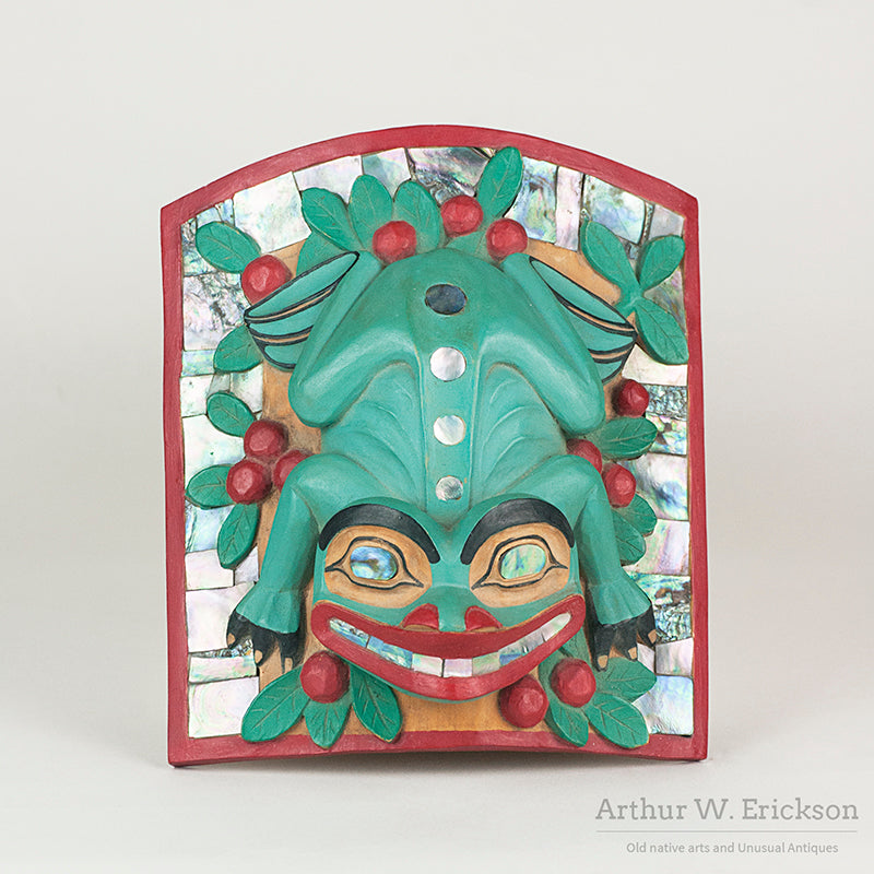 This is a delightful piece of Don Lelooska's art. The frontlet has a large green carved frog with red lips and abalone shell eyes and mouth covering the frontlet amid green leaves and red berries. The frontlet has abalone panels across the top and along the sides and a narrow red painted border around all four sides of the carving. It is signed "Lelooska 69" on the back