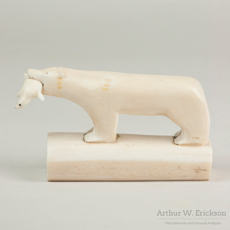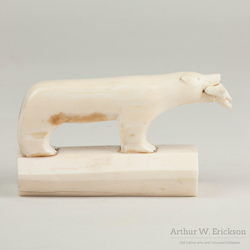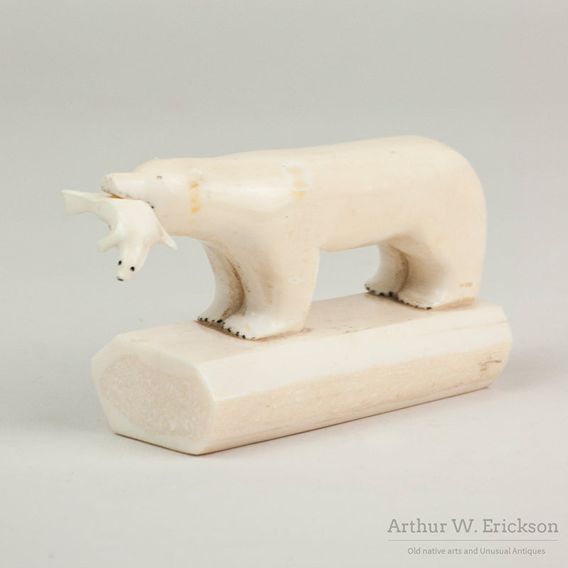 Inuit Carved Walrus Ivory Polar Bear with Lunch