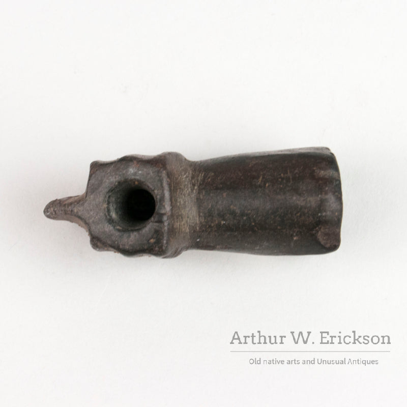 This is a small, interesting and well carved small stone pipe, probably carried when traveling. It has a slightly expanding bowl with flat edges on each side going about half way down; these were probably done to make it more secure when held between between the thumb and the finger. The lower section of the pipe has two parallel groves running three quarters around the base with a triangular cut away section below it with a hole with coned sides. The lower edge of the base and the cut away section have fine ticking for design. The pipe came in an old small midwest family collection with a few large points from the Tennessee, Kentucky, Missouri area. I have no other information on the pipe.