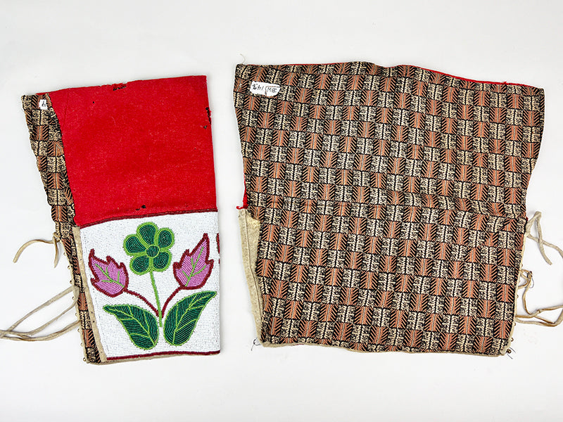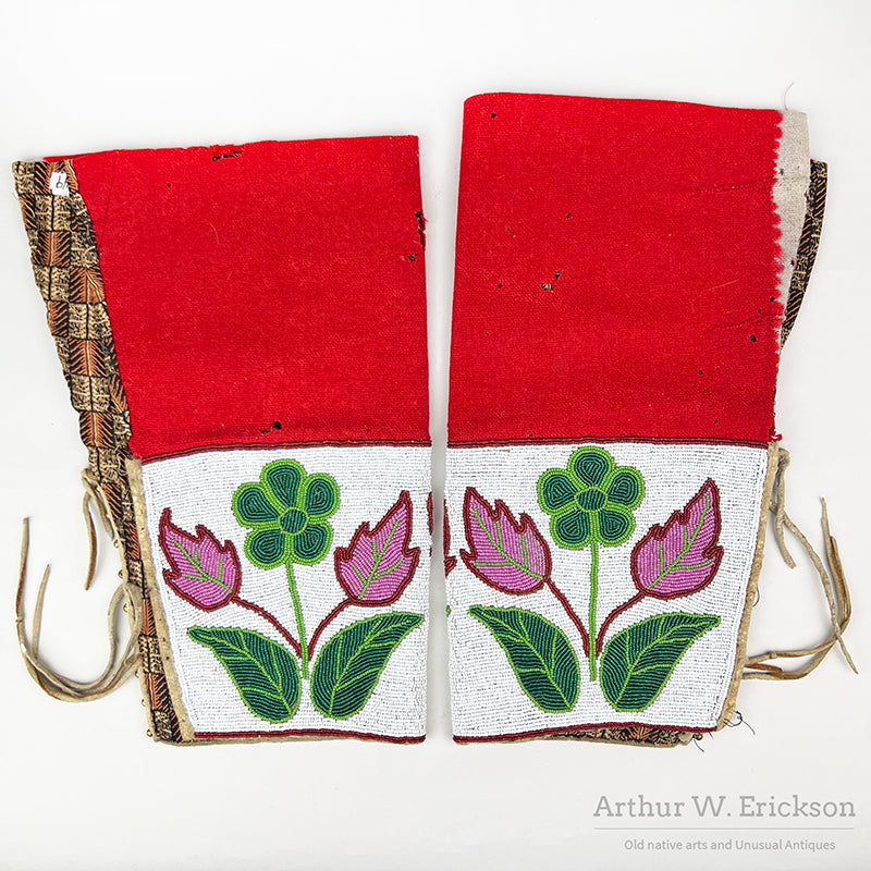 The leggings have an interesting design with a green flower with leaves of red and pink above two green leaves on a white beaded background. The top of the leggings are red trade cloth and the leggings are lined with a wild cloth. These are good looking leggings and will show well.